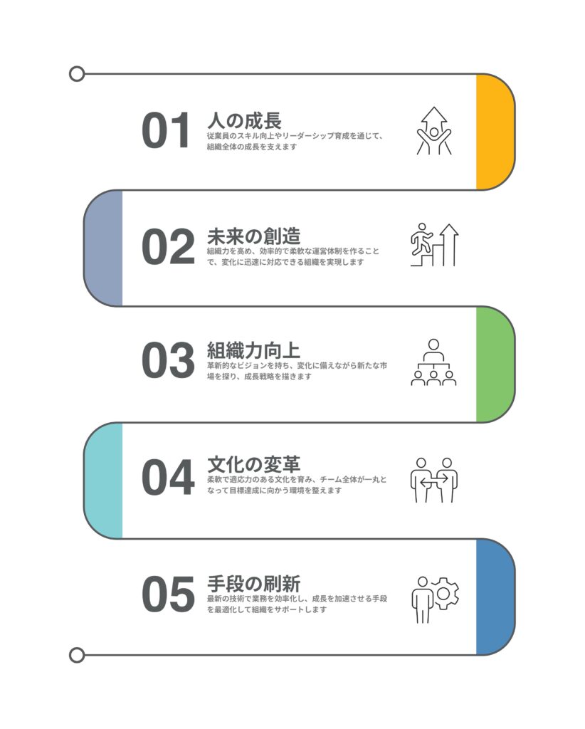 企業の未来を共に創り上げるために、私たちはこれら5つのコアを活用し、組織全体を包括的に成長させます。